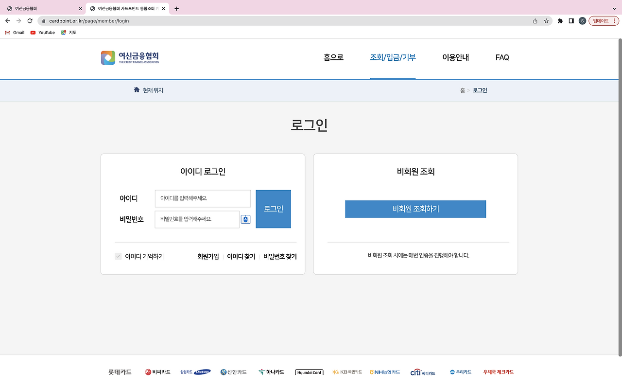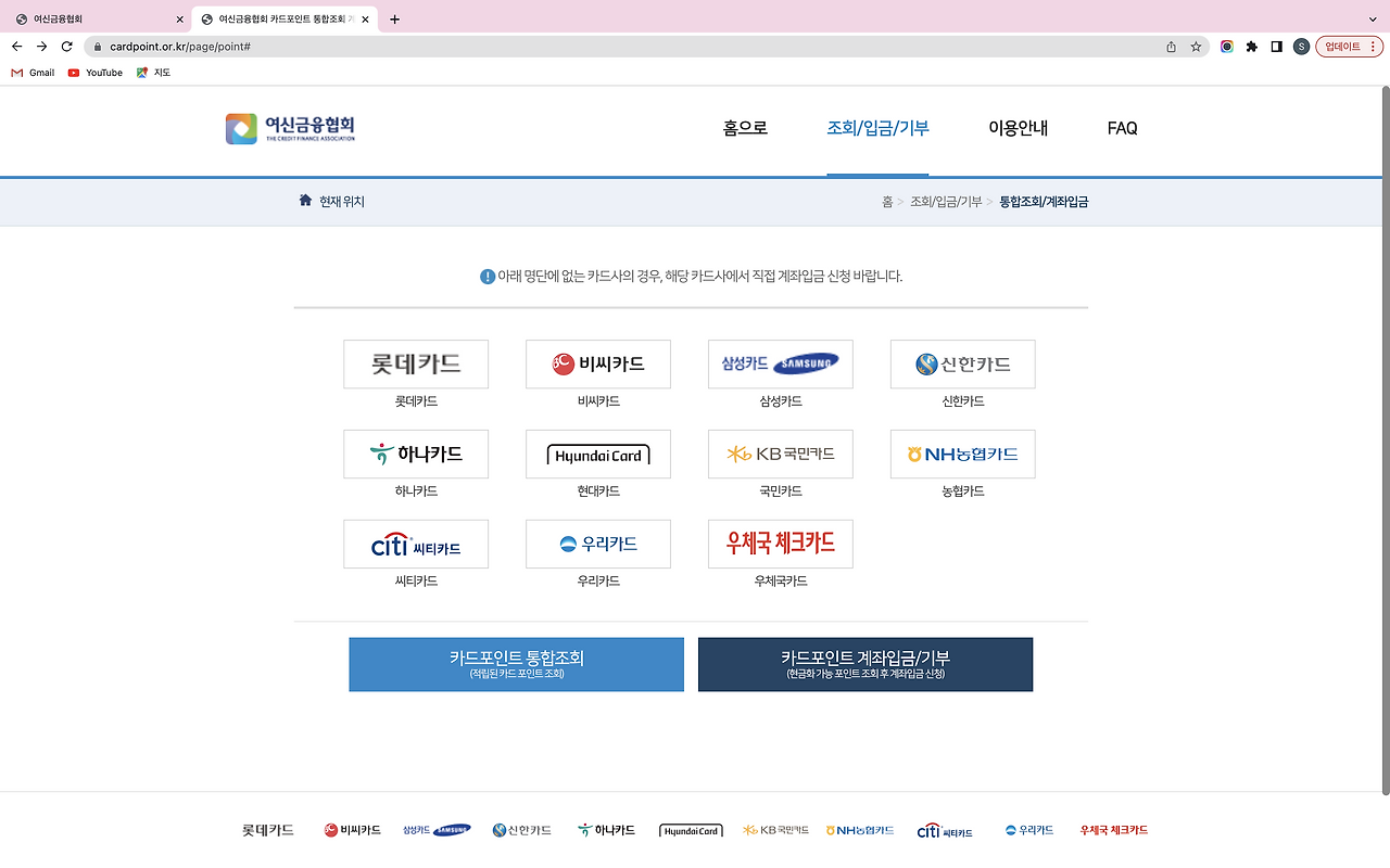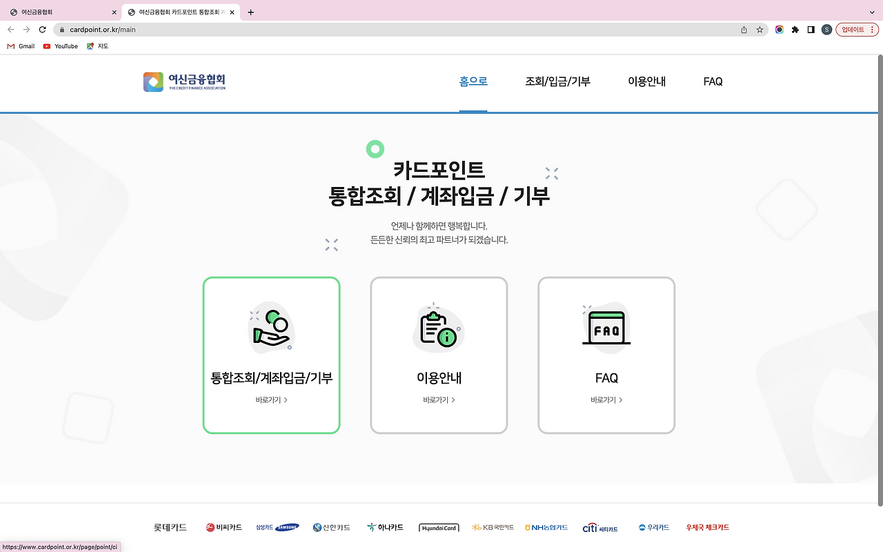 신용카드 발급하고 용돈 벌자최대 26.5만원 캐시백뱅크샐러드마지막 수정 2024.12.18신용카드 혜택 1원까지 비교해서 내 소비에 맞는 카드 찾고싶다면? 뱅크샐러드가 4,320개 카드와 10만개 혜택 정보를 기반으로 나에게 맞는 카드를 찾아드려요.몇 년 전, 큰 인기를 끌었던 ‘카드포인트 현금화하기’. 새해로 넘어가 소멸되기 전에 카드포인트를 현금화하는 ‘꿀팁’이 각종 커뮤니티 인기글에 오르고 카톡이나 문자로 이 내용이 공유되었었는데요. 지금도 카드포인트를 현금화 할 수 있을까요? 카드포인트 통합조회 방법카드포인트 현금화 기간여신금융협회 카드포인트 통합조회 서비스여신금융협회 카드포인트 통합조회 방법여신금융협회 카드포인트 통합조회 과정카드포인트 조회 가능 카드사카드사별 카드포인트 계좌입금 시점 카드포인..